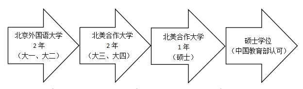 本硕连读2+2+1:参加实验班的学生在北外完成大一和大二课程,之后转入北美合作学校继续学习剩余的本科(约两年)及硕士课程(约一年),获得受教育部认可的国外大学硕士学位。学生完成本科阶段学习后,也可向我院申请其他合作大学(不限国家及专业)的硕士课程。